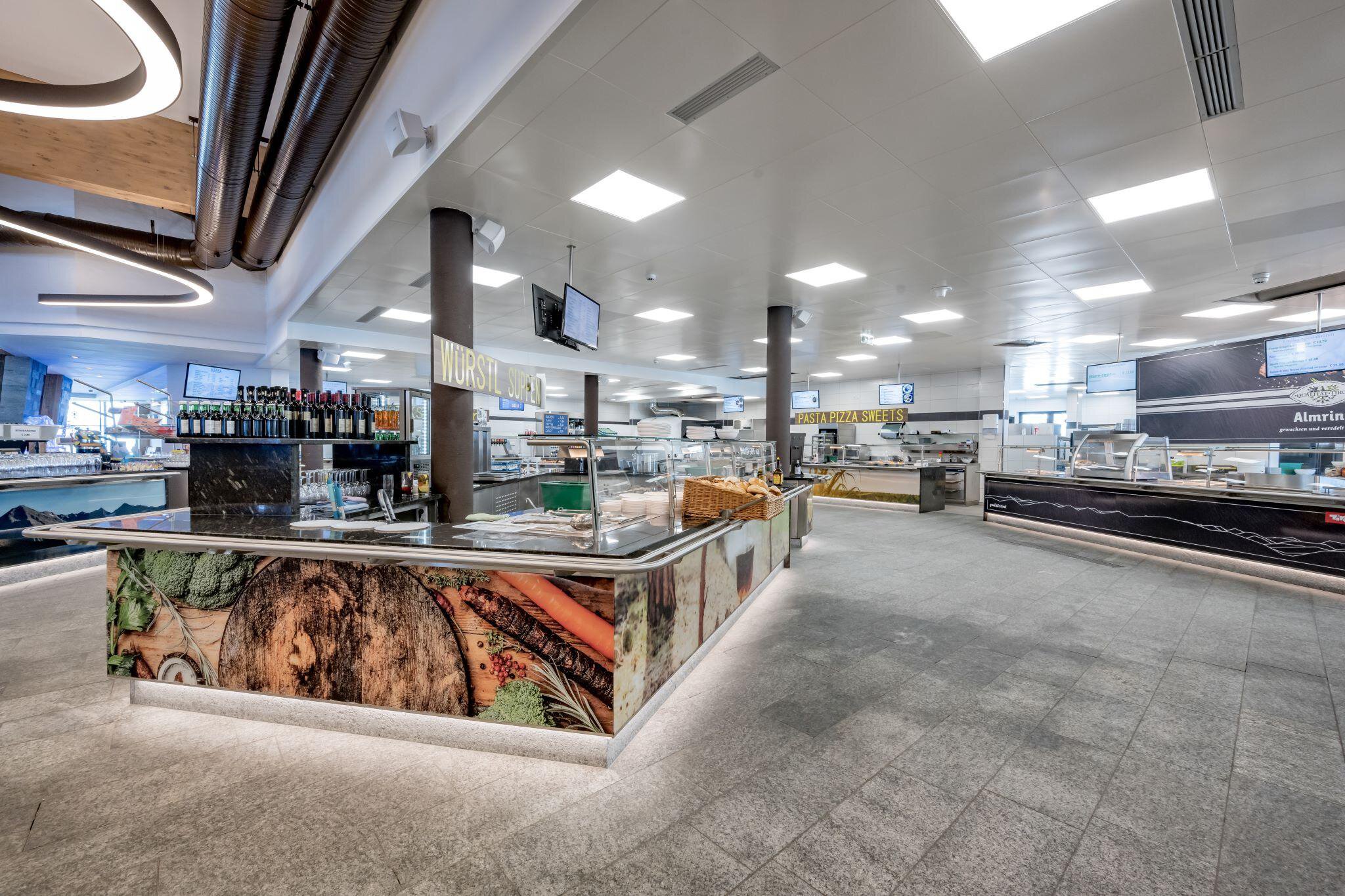 Unser komplett erneuertes Rettenbach Market Restaurant erstrahlt nach dem Umbau in neuem Glanz und vereint TRADITION und MODERNE. Mit viel Liebe zum Detail wurde das neue Restaurant modernisiert. Gemütliche Stuben und Nischen laden zum Entspannen und Genießen ein. Neben dem erstklassigen Selbstbedienungsrestaurant findet nun auch unser Bedienungsrestaurant GLETSCHERTISCH (im 1. Stock) seinen Platz am Rettenbach Gletscher. Unser Küchenteam begeistert Sie mit feinsten Speisen aus unserer neuen Schauküche. Inmitten der traumhaften Kulisse der Ötztaler Alpen dürfen sich unsere Gäste mit allen Sinnen verwöhnen lassen und sich an verschiedensten kulinarischen Köstlichkeiten erfreuen. In unserem Selbstbedienungsbereich erwarten Sie von traditioneller Tiroler Küche über Suppen, Salate, Pizza & Pasta und Süßspeisen bis hin zu diversen Variationen vom Grill. Unser unverwechselbarer Standort mit Blick auf den Weltcuphang macht Lust auf mehr und rundet unser Angebot ab. So können Sie sich selber entscheiden, welche Variante besser in ihren Skitag passt. Wir freuen uns auf Sie. Ihr Gletscher Arena Team
